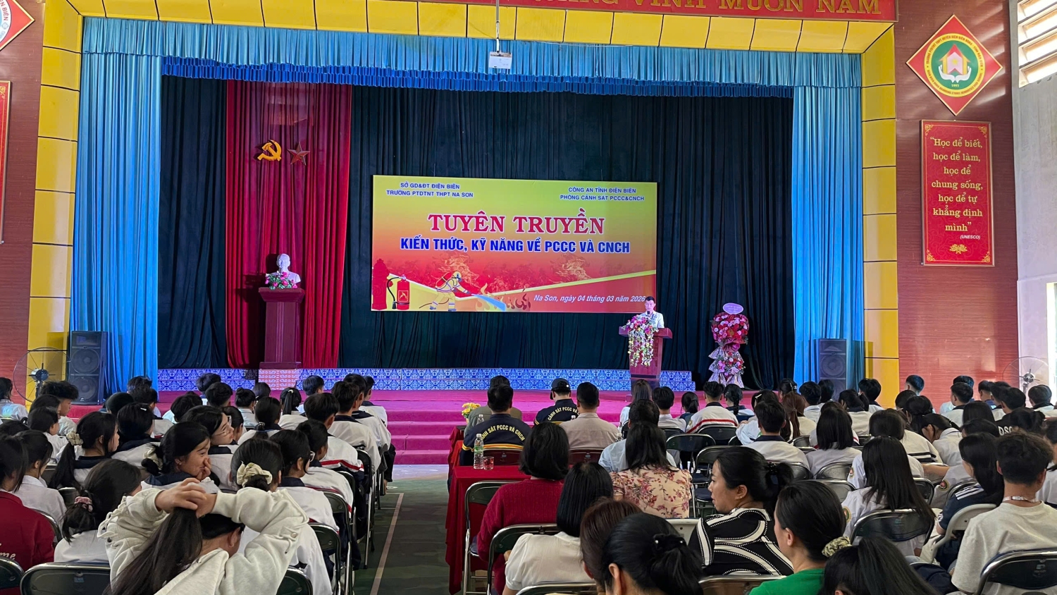 Thực hiện thông báo số 270/PC07-DD2 ngày 24/02/2026 của công an tỉnh Điện Biên, vào hồi 14h30 phút ngày 04/03/2026, trường Phổ thông DTNT THPT Na Son đã phối hợp với công an tỉnh Điện Biên tổ chức buổi tuyên truyền kiến thức, kĩ năng phòng cháy chữa cháy và cứu nạn cứu hộ cho toàn thể các cán bộ giáo viên, nhân viên, học sinh trong toàn trường.
