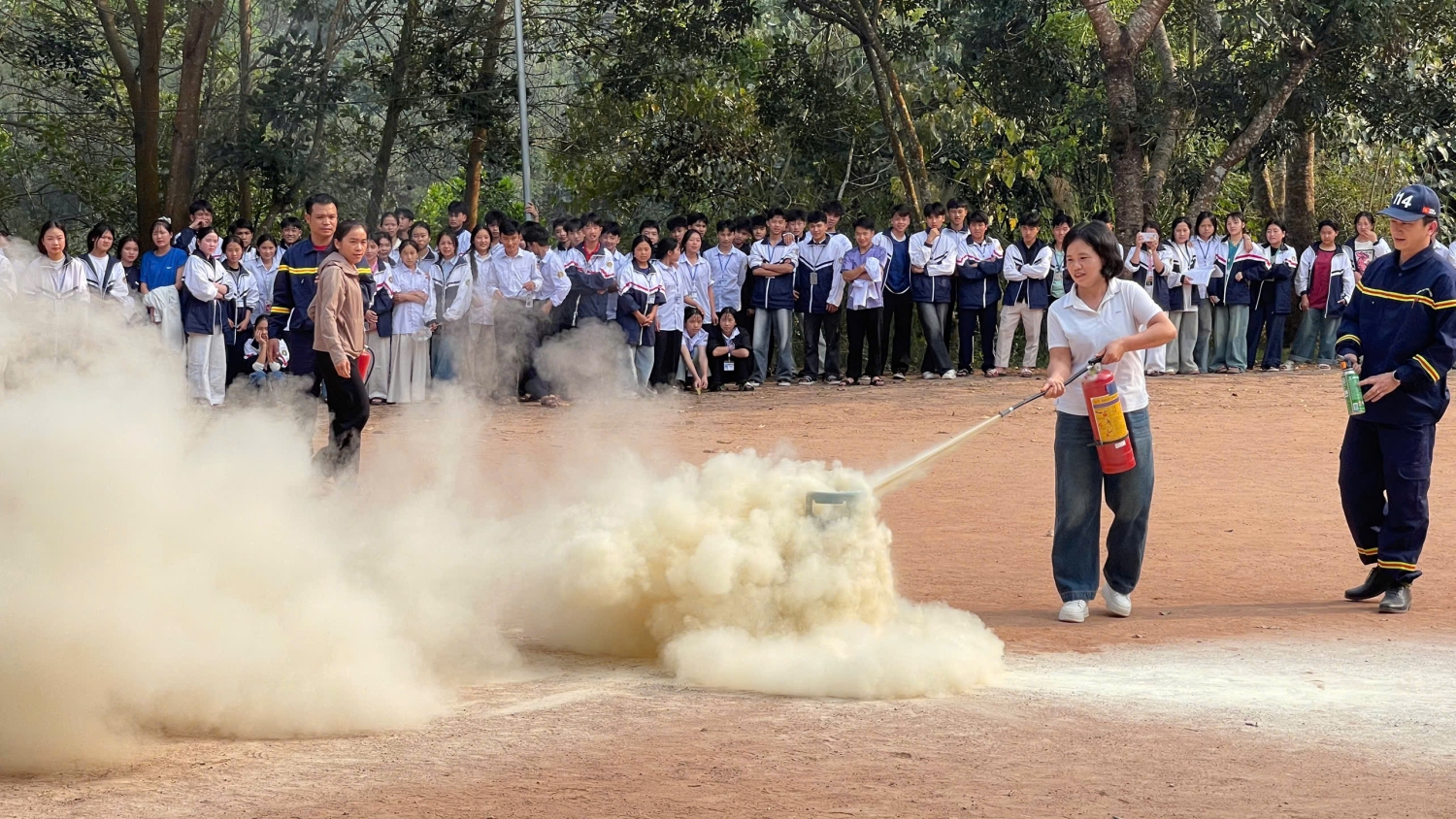 Sau khi giới thiệu, giảng giải những kiến thức, kĩ năng cần thiết, đồng chí…đã hướng dẫn các cán bộ giáo viên, nhân viên, các em học sinh thực hành cụ thể kĩ năng PCCC và cứu người bị nạn. Tất cả các cán bộ, giáo viên, nhân viên, các em học sinh đều chăm chú theo dõi và thực hành kĩ năng thành công. Đây là một trong những bài học quan trọng trong cuộc sống của chúng ta bởi những tai nạn nguy hiểm có thể rình rập khắp nơi.