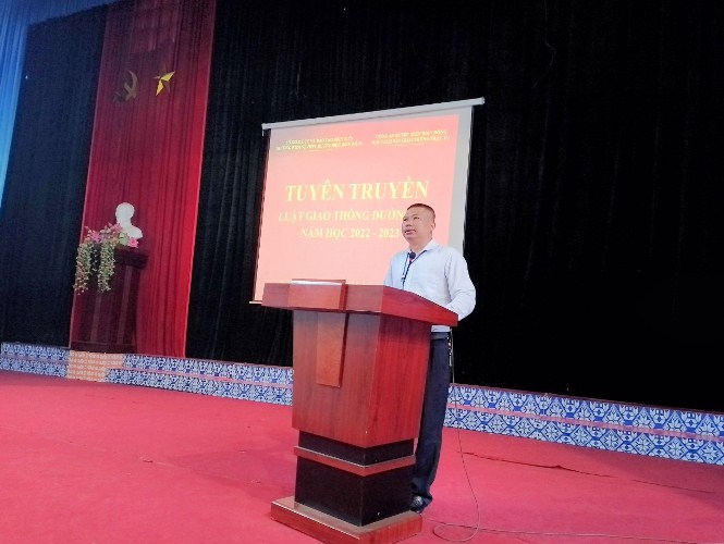 Tiếp đến đồng chí trung tá Nguyễn Tuấn Đức - Đội trưởng đội Cảnh sát Giao thông trật tự công an Huyện đã thực hiện nội dung tuyên truyền về Luật Giao thông đường bộ. Qua tuyên truyền và giao lưu câu hỏi đã giúp mỗi đồng chí cán bộ, giáo viên và học sinh nắm vững hơn các quy định của pháp luật về tham gia giao thông đường bộ, từ đó nâng cao ý thức chấp hành pháp luật khi tham gia giao thông.