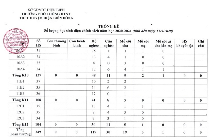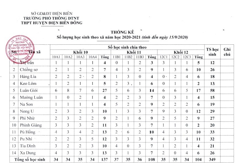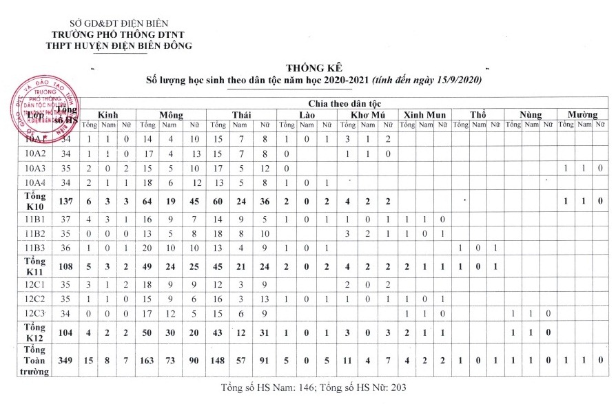 Trường Phổ thông DTNT THPT huyện Điện Biên Đông công khai thống kê số lượng học sinh năm học 2020-2021