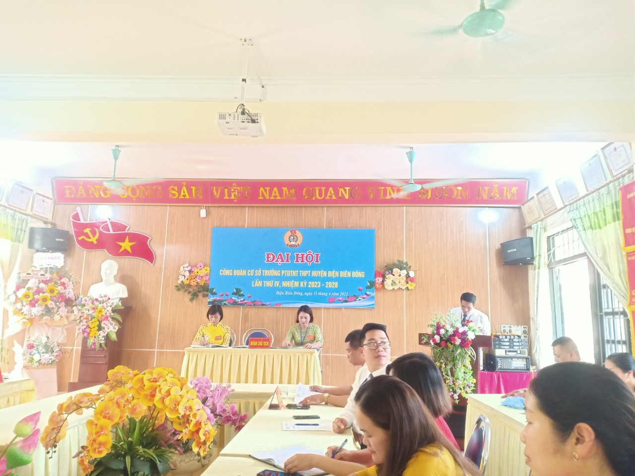 Tại Đại hội, Đoàn chủ tịch đã thông qua báo cáo tổng kết hoạt động công đoàn nhiệm kỳ 2015-2023 với nhiều thành tích đáng ghi nhận: Công đoàn cơ sở nhiều năm liền đạt danh hiệu “Công đoàn cơ sở hoàn thành tốt nhiệm vụ” trở lên. Được LĐLĐ tỉnh tặng “Cờ thi đua toàn diện” và Bằng khen; được Công đoàn ngành Giáo dục Điện Biên và LĐLĐ huyện Điện Biên Đông tặng nhiều giấy khen. Nhà trường được UBND tỉnh Điện Biên công nhận danh hiệu “Tập thể lao động xuất sắc”, “Cờ thi đua xuất sắc” và tặng bằng khen của UBND tỉnh, bằng khen của Bộ Giáo dục và Đào tạo và nhiều giấy khen của Sở Giáo dục và Đào tạo Điện Biên, UBND huyện Điện Biên Đông. Đồng thời Đoàn chủ tịch cũng thông qua dự thảo phương hướng trong nhiệm kỳ tới 23023-2028.
